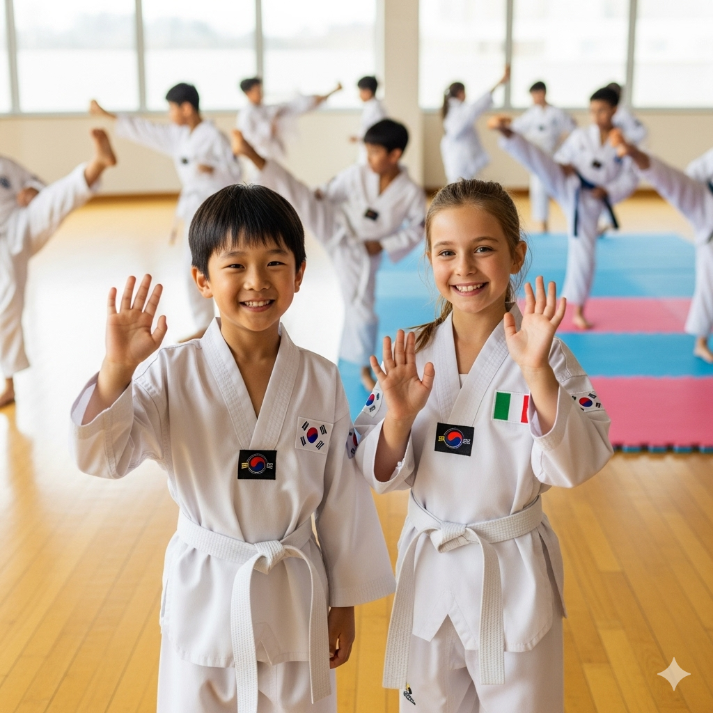 Anche in Italia, il paese della pizza e del gelato, ci sono tanti bambini e bambine che praticano l’Han Moo Kwan e il Taekwondo! 🍕🍦 Questa meravigliosa arte marziale è arrivata nel nostro paese tanti anni fa, grazie a dei maestri coreani coraggiosi che hanno attraversato il mondo per condividere la loro passione. All’inizio erano in pochi a conoscerla, ma poi, piano piano, si è diffusa in tutta Italia, conquistando il cuore di tantissime persone.
