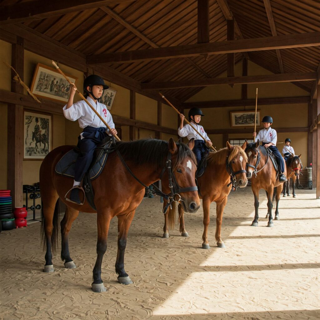 Inoltre, le tecniche potevano variare leggermente da regione a regione, a seconda del tipo di cavalli disponibili (alcuni erano più piccoli e agili, altri più robusti) e dell’uso principale che se ne faceva (montagna ⛰️ vs pianura, guerra vs trasporto). Questa varietà arricchisce la storia del Jobajutsu.